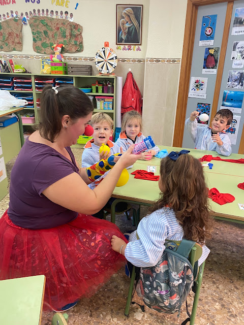 Hemos podido disfrutar en clase de la visita de un grupo de madres y un papá, muy divertid@s, que nos han invitado a entrar en un Circo muy especial en el que los Malabaristas eran los protagonistas y como no, nos han enseñado a hacer unas cariocas especiales.